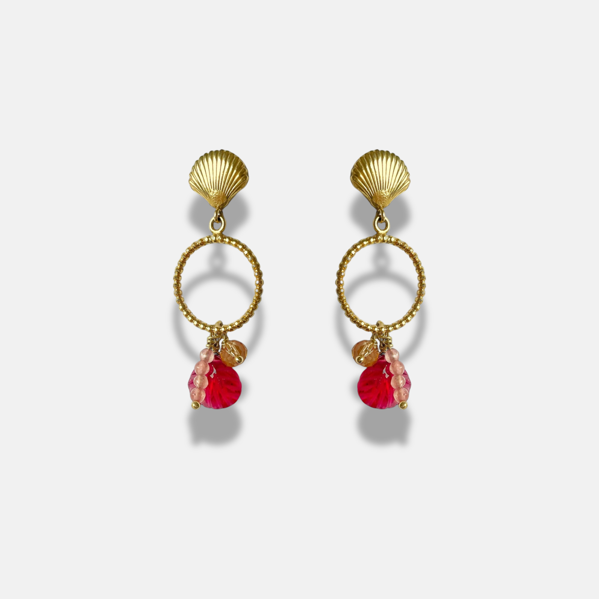 Precioso aro con movimiento, tiene una casquilla en forma de concha con una argolla granulada que a su vez lleva piedras de diferentes tamaños y formas que le aportan movimiento y color.