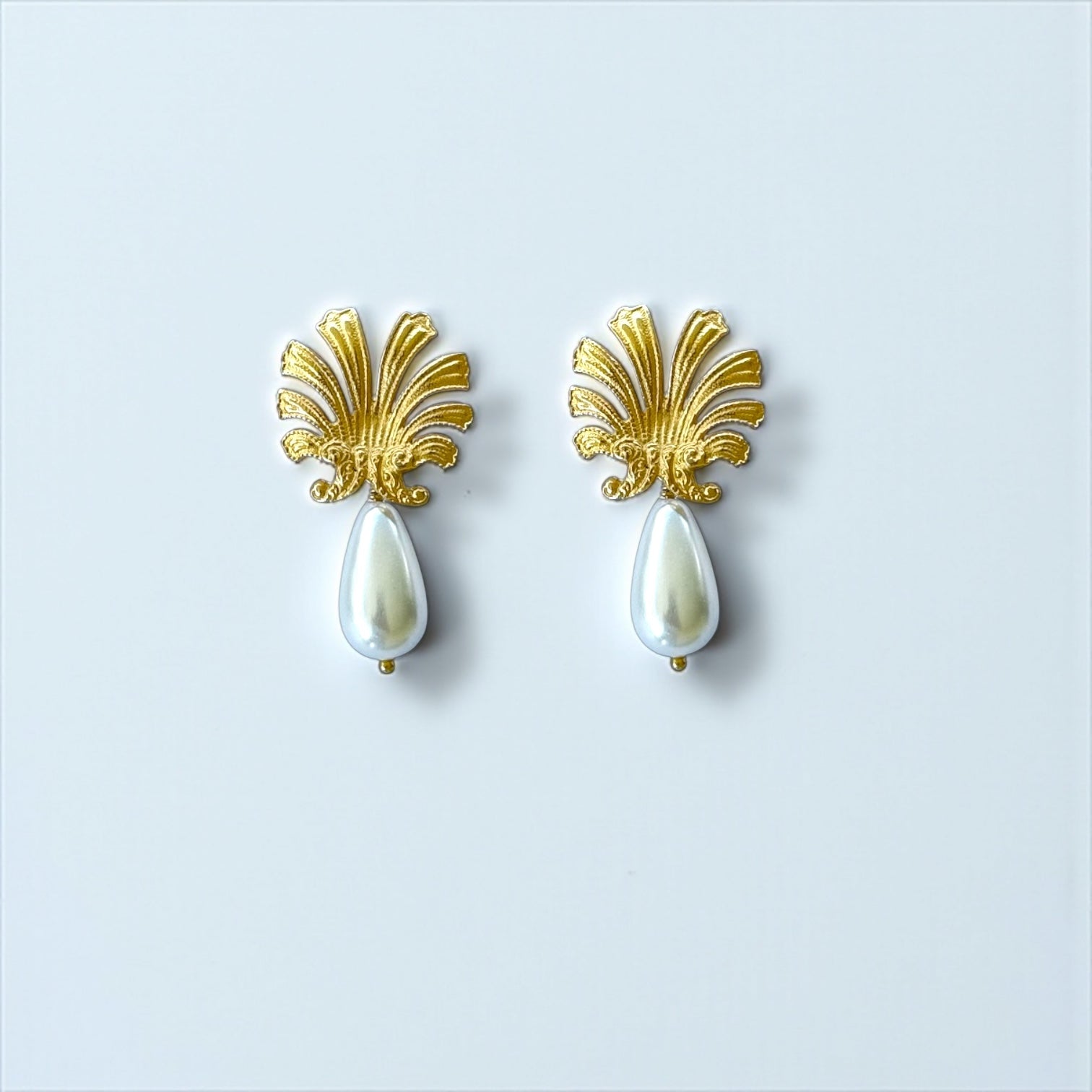 Aro labrado en bronce bañado en oro, esta pieza brilla e ilumina como ninguna, de tamaño mediano, la hicimos a partir de un collar vintage inglés con la técnica de la cera perdida logrando esa luz satinada y mate tan especial que se potencia con la perla en forma de gota.