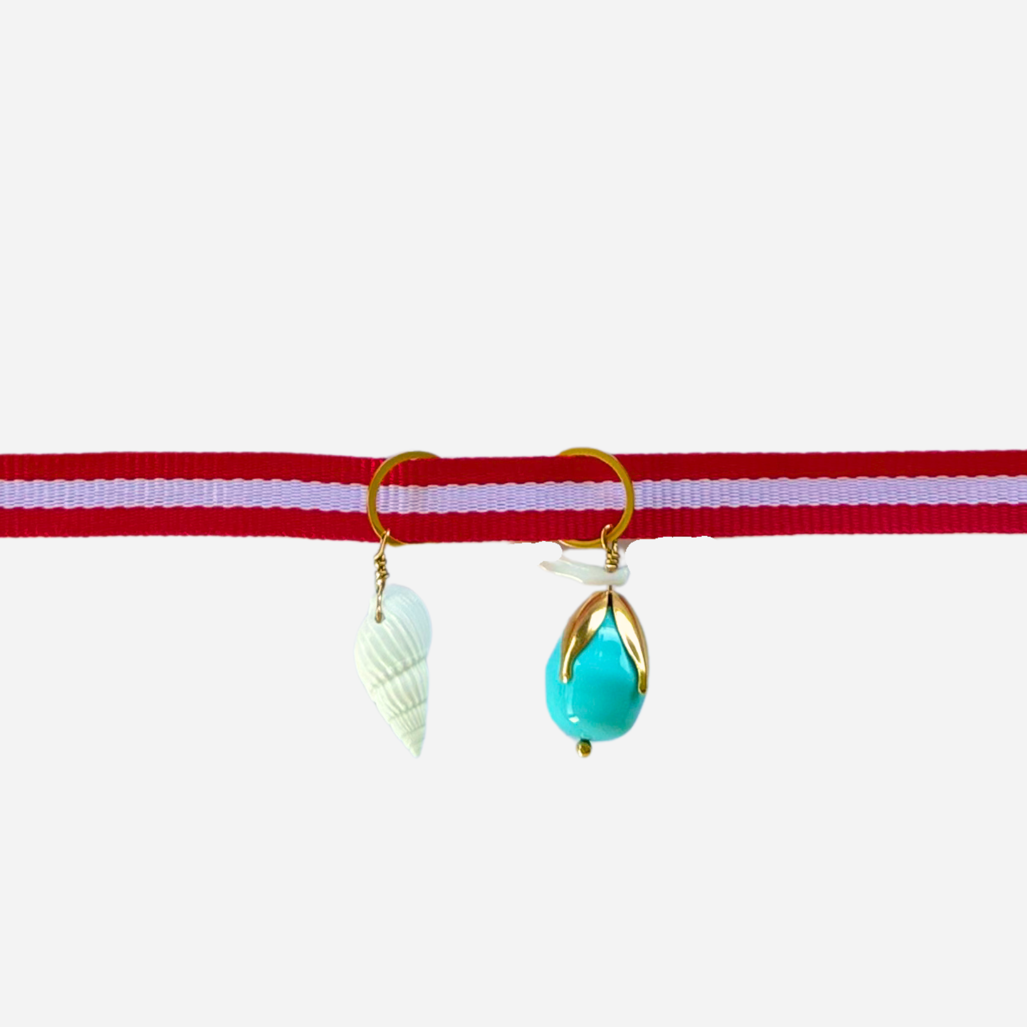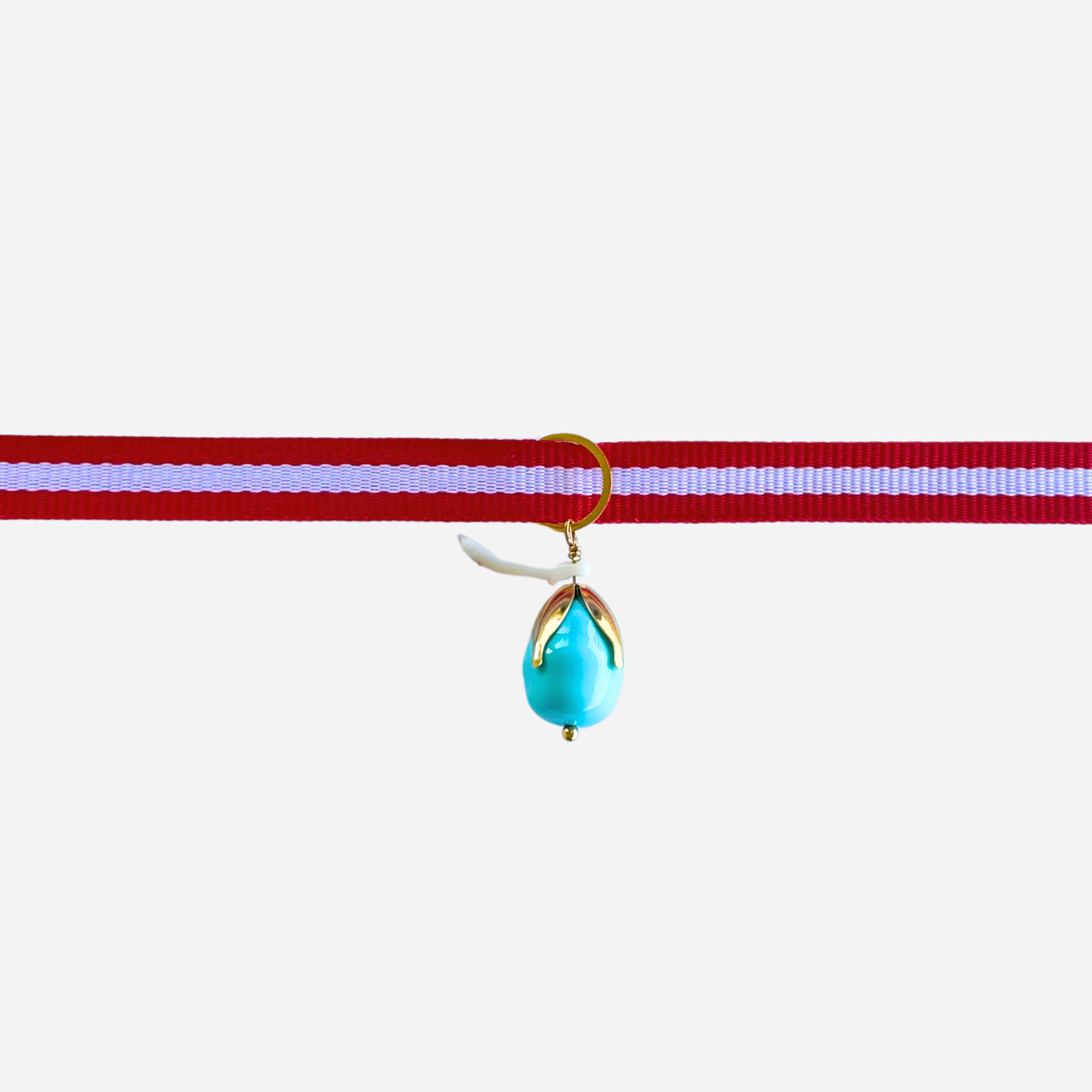 Pequeño fruto de cerámica esmaltada con casquilla de bronce bañada en oro, un amuleto luminoso del Mediterráneo que puedes usar con la cinta como collar como pulsera o bien ponerlo en alguna cadena dorada o collar de piedras.