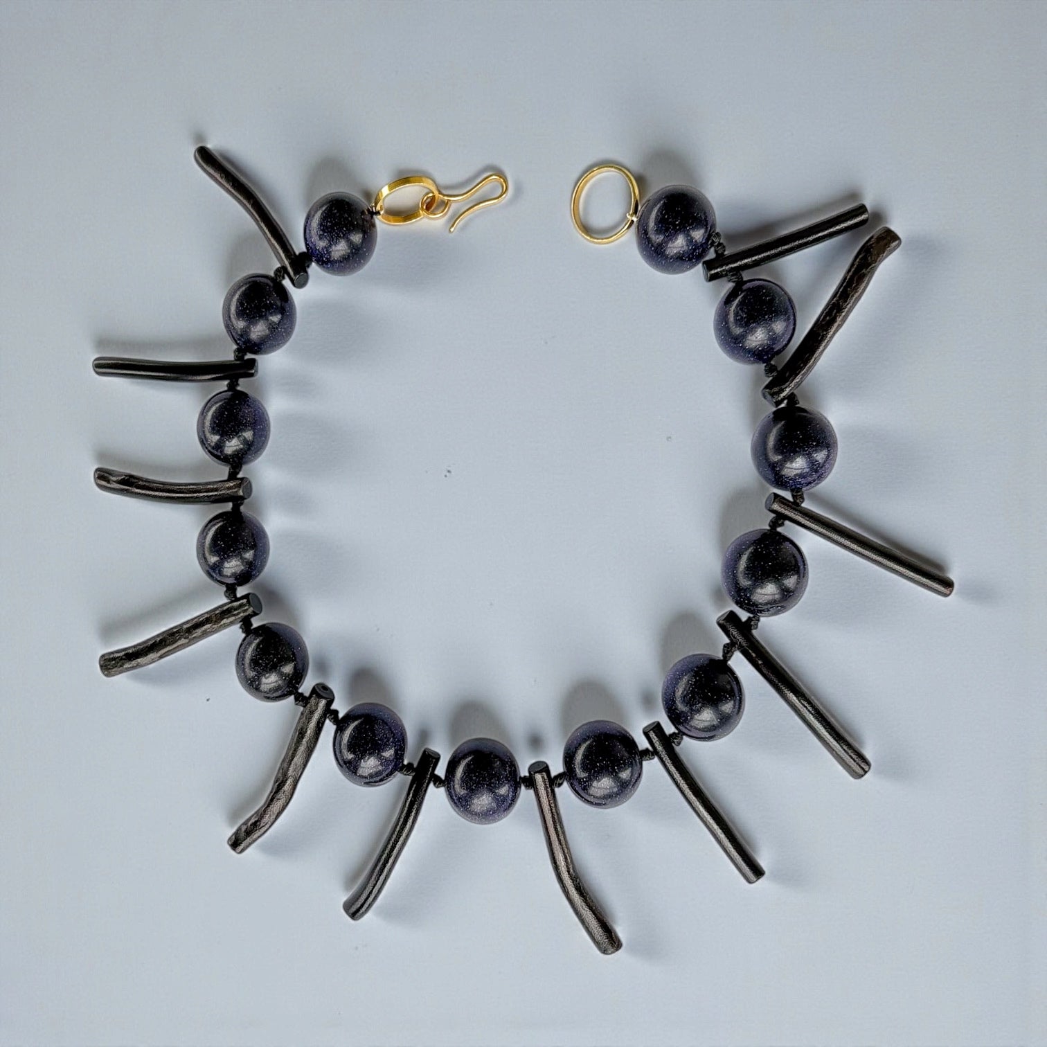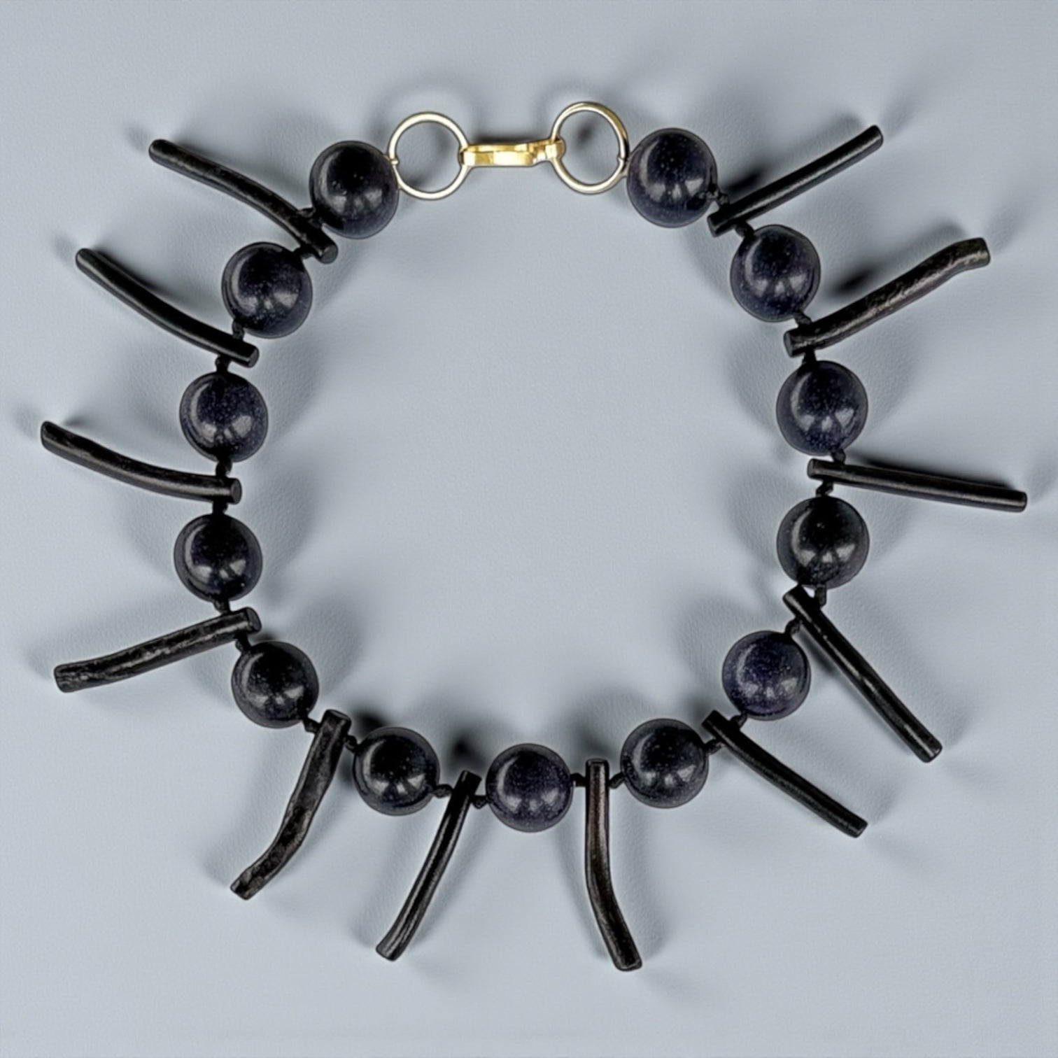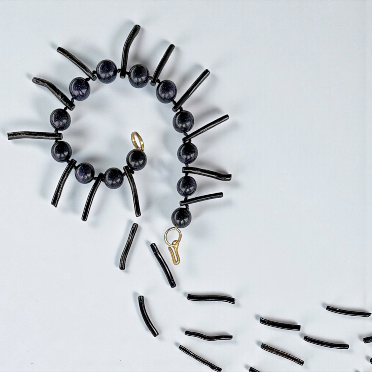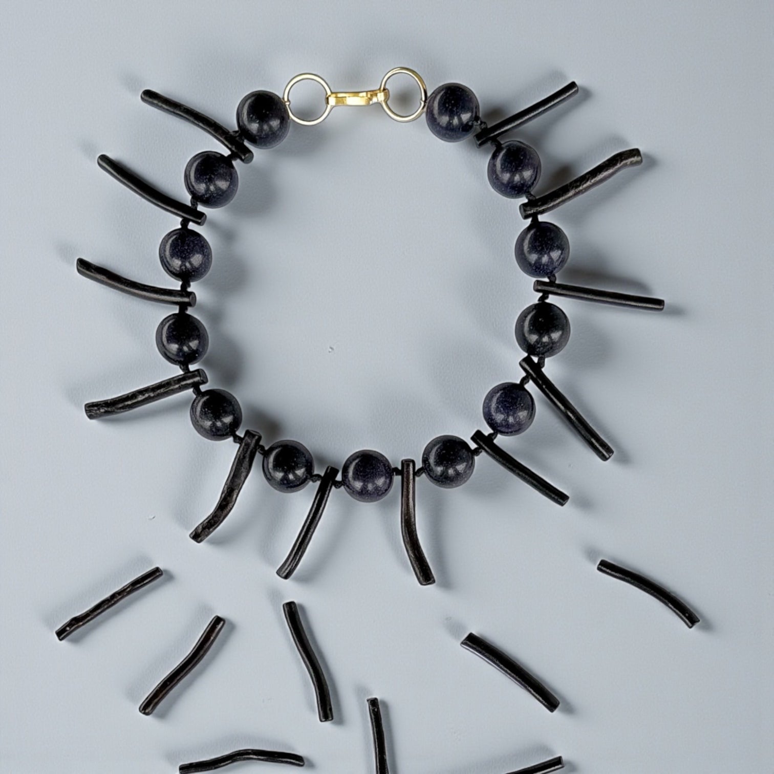 El coral negro evoca raíces marinas y las piedras de polvo de estrellas aportan ese fulgor cósmico.
