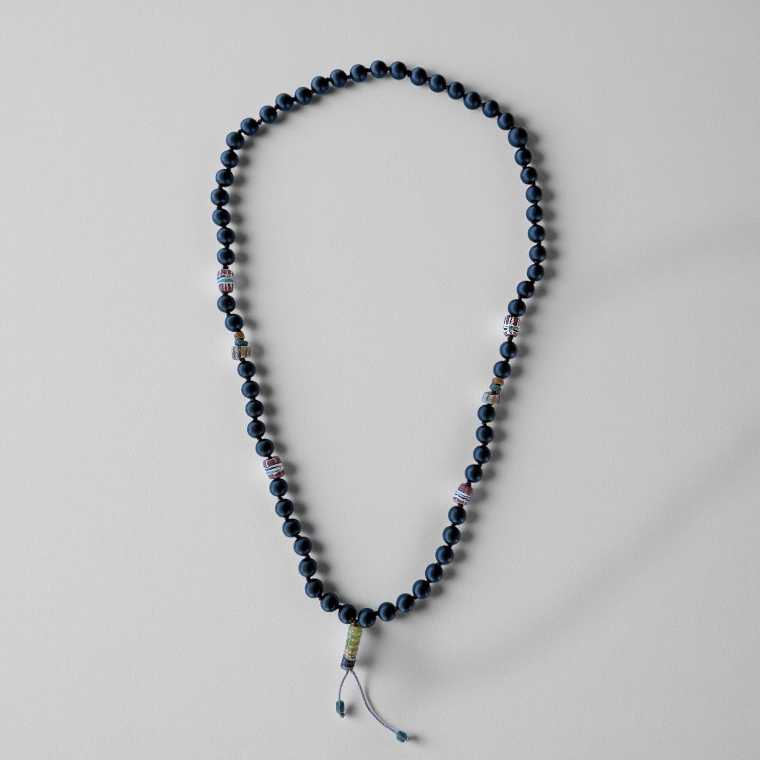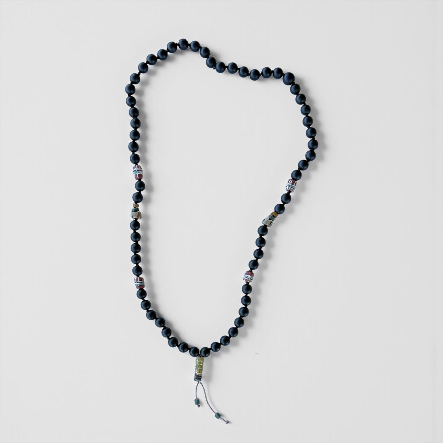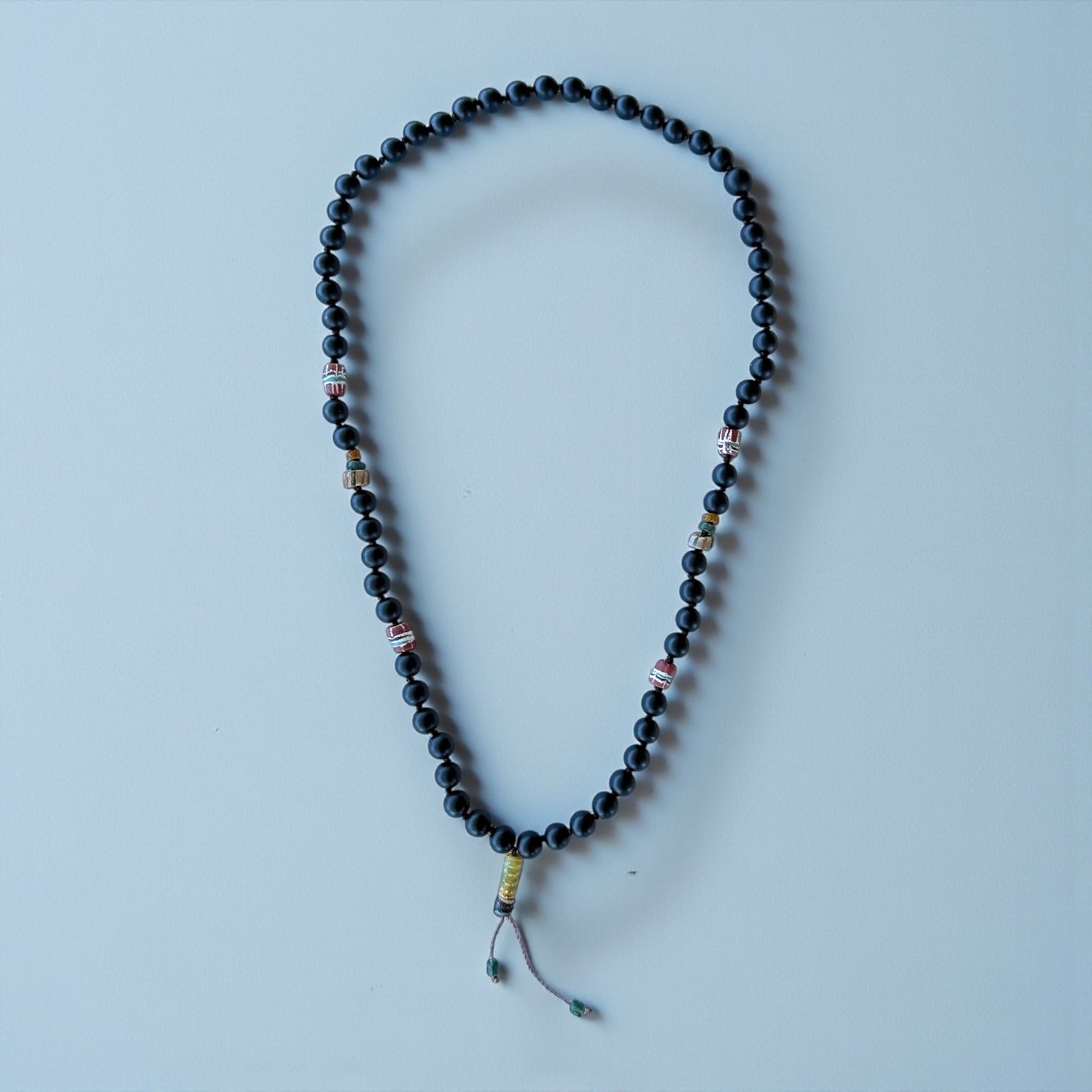Collar unisex hilado a mano con nudos entre cada piedra, onix matte es su color principal mezclado con piedras recicladas de vidrio africano pintadas a mano vintage en tonos burdeo, amarillo y gris, perfecto para usarlo todo el año.