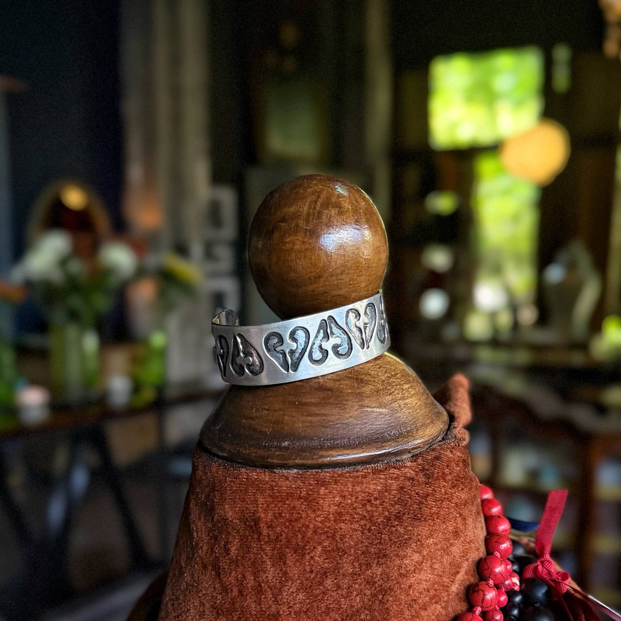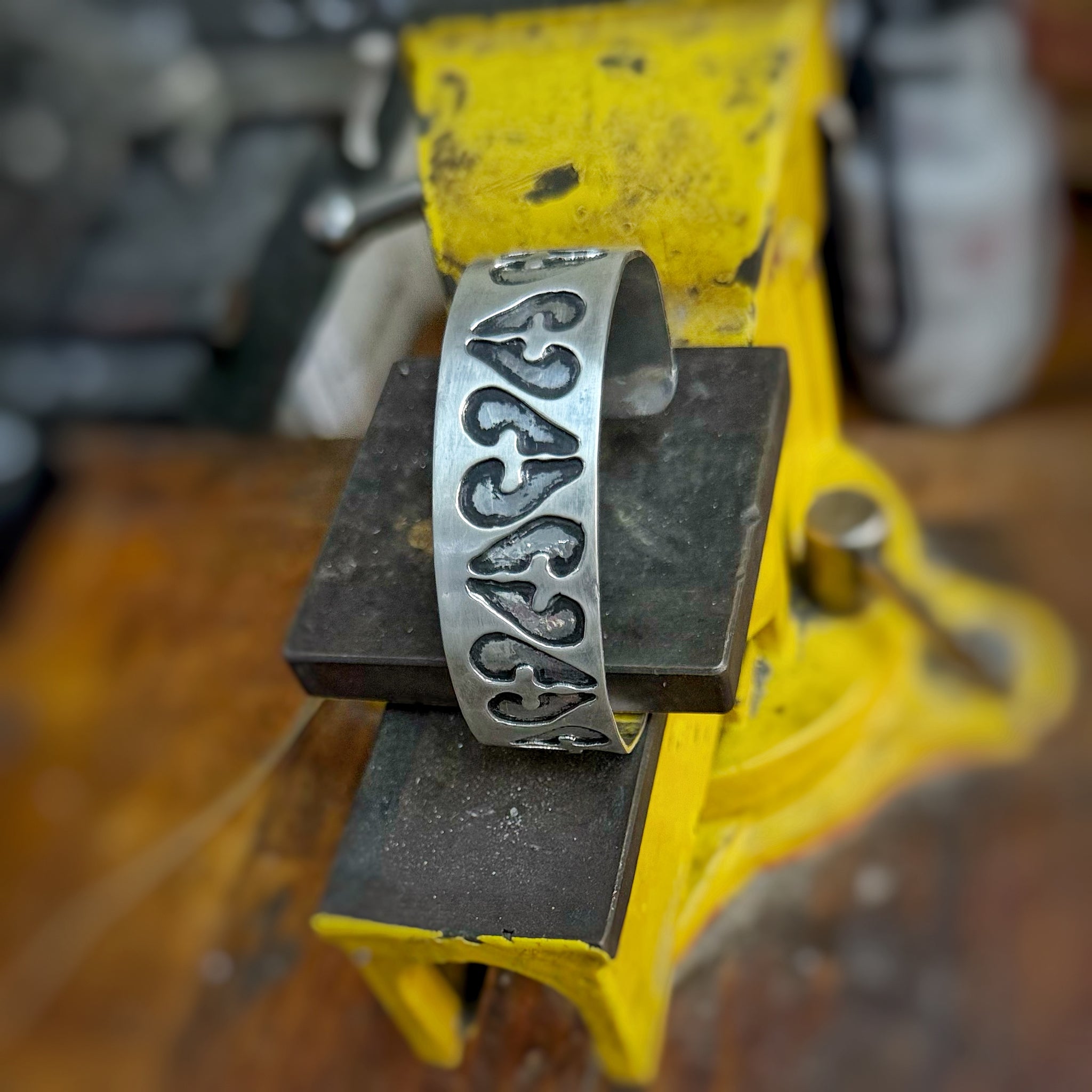 Tallada a mano en plata, conserva las huellas del proceso: líneas que no buscan simetría, sino realidad. Trabajada con paciencia, dejándole un ritmo propio, casi ancestral. Es una pieza firme, limpia, como un gesto de oficio y permanencia.