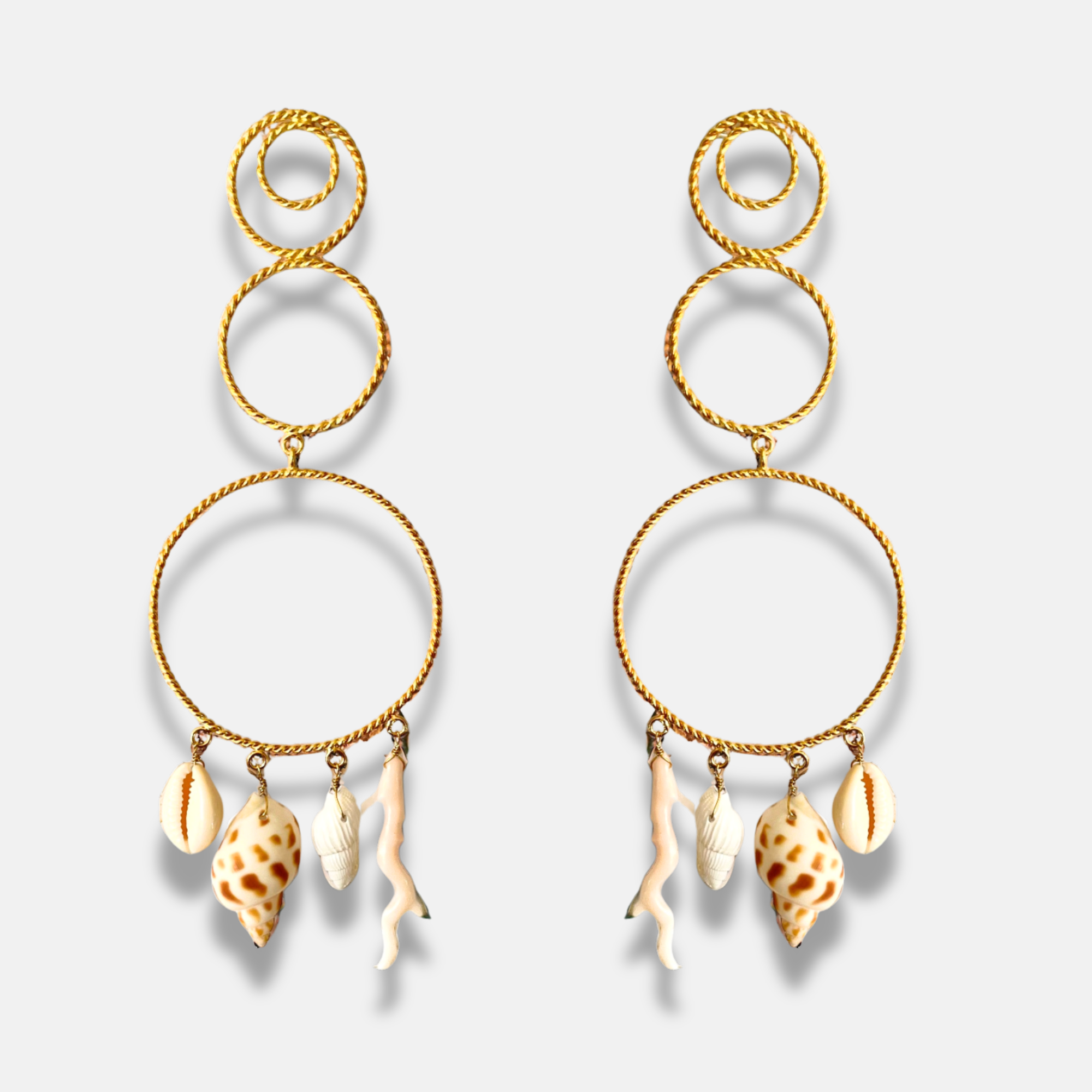 Formado por tres argollas entorchadas a mano que con gracia y movimiento terminan en un mix de conchas y corales sin igual! Tan liviano como no te imaginas a pesar de su tamaño y bailará contigo al ritmo de la música .