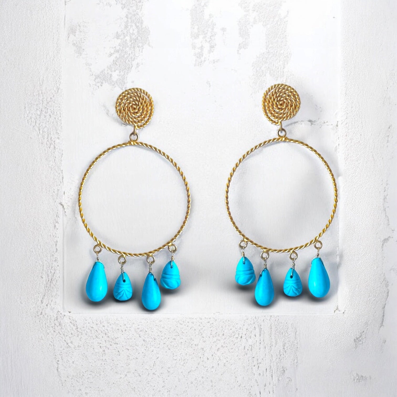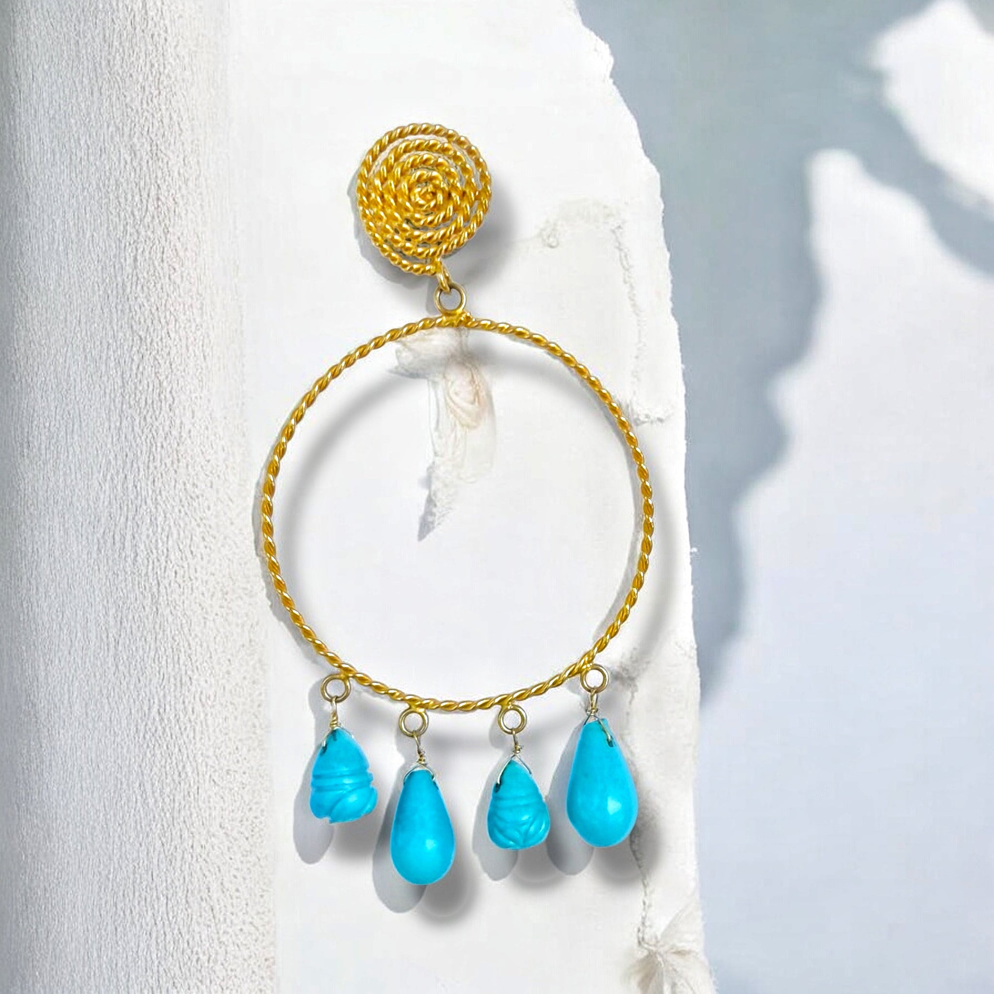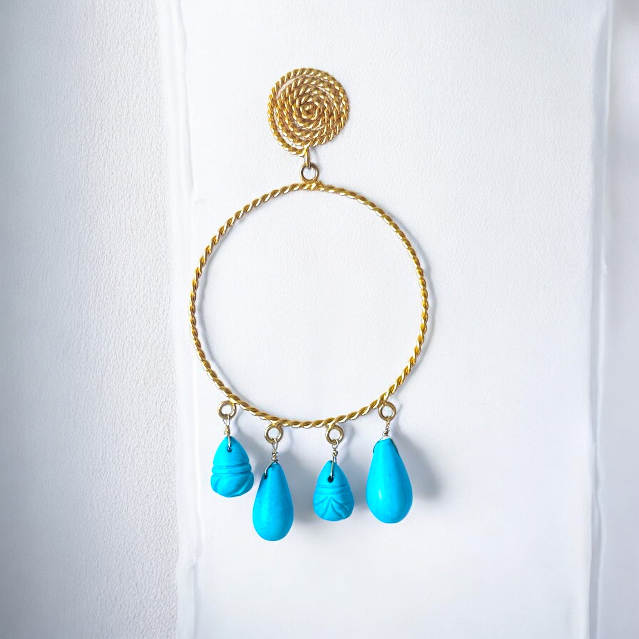 Argolla y casquilla entorchada manualmente en bronce bañado en oro, gotas de turquesa natural bailan al viento.